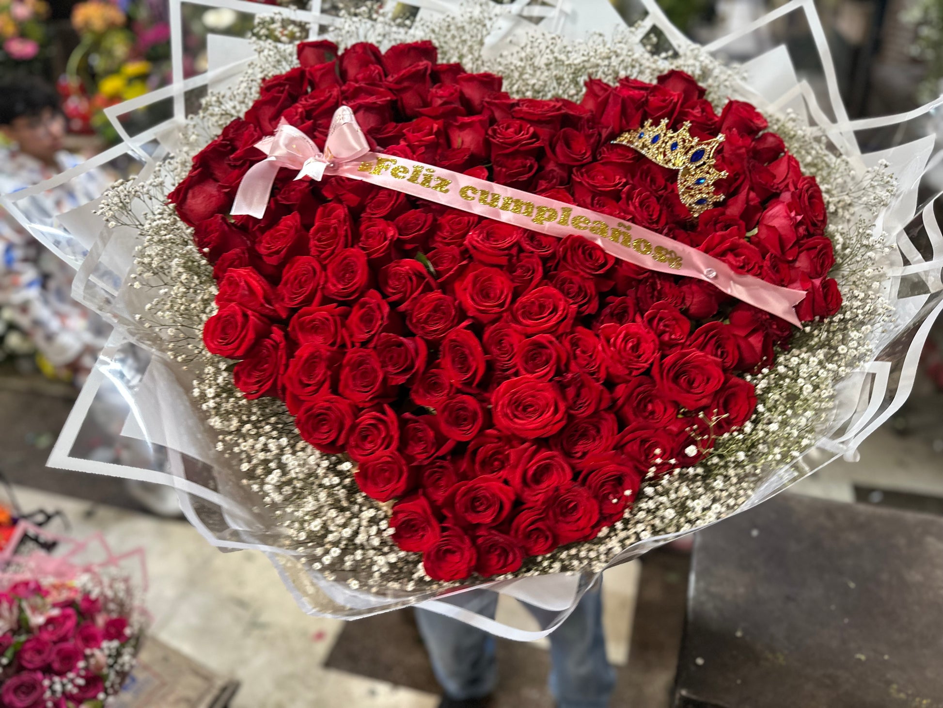 ramo de rosas en forma de corazón con diadema y listón con frase