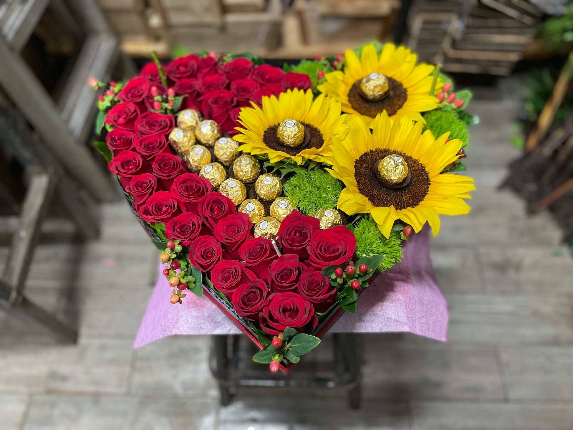 corazon de rosas rojas con 16 ferreros y 3 girasoles. caja de 40 x 40 cm.